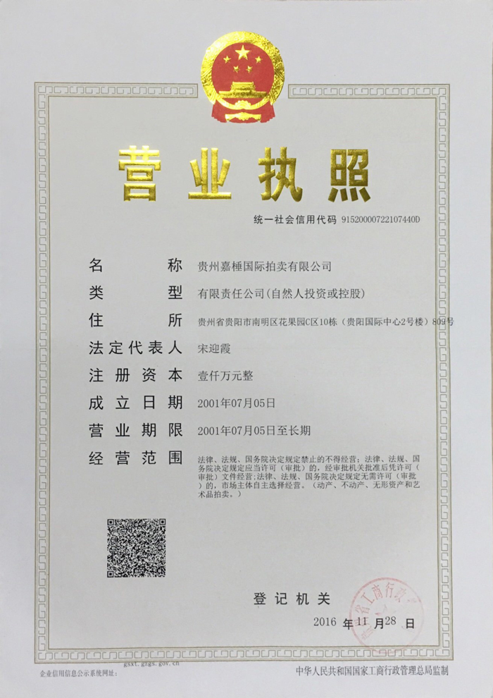 貴州嘉棰國際拍賣有限公司是主要從事動產、不動產、無形資產和文物藝術品拍賣業務的大型綜合性拍賣企業,是中國拍賣行業協會會員,貴州省拍賣行業協會理事單位,中國拍賣行業協會AA級資質企業,貴州省連續十一年重合同守信用企業,全省拍賣先進企業,貴州省公物拍賣人。公司充分利用多年來積累的客戶資源和全新的經營理念服務于貴州經濟發展。同時也為貴州省國有企業的資產重組、改制改造以及不良資產的變現,起到積極的作用。貴州嘉棰國際拍賣有限公司自成立以來,多次成功地組織了房產、土地、機器設備和各種物資等標的拍賣。并于2001年12月成為第一批貴州省高級人民法院及多家金融機構指定的拍賣企業。 公司下設產權部、市場發展部、財務部、人事部和辦公室?,F有員工11名,大專以上學歷員工占總數的90%,擁有精通業務的專門人才。有國家注冊拍賣師3名,公司工作人員大多參加過中國拍賣行業協會組織的從業資格培訓。公司堅持“客戶至上,執業嚴謹,公平競.....